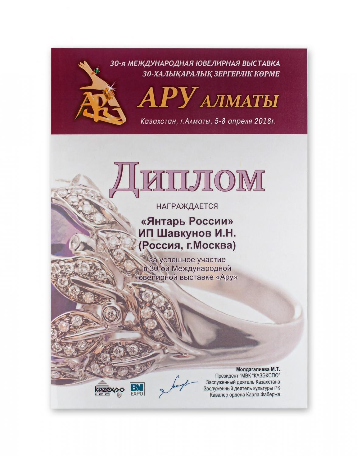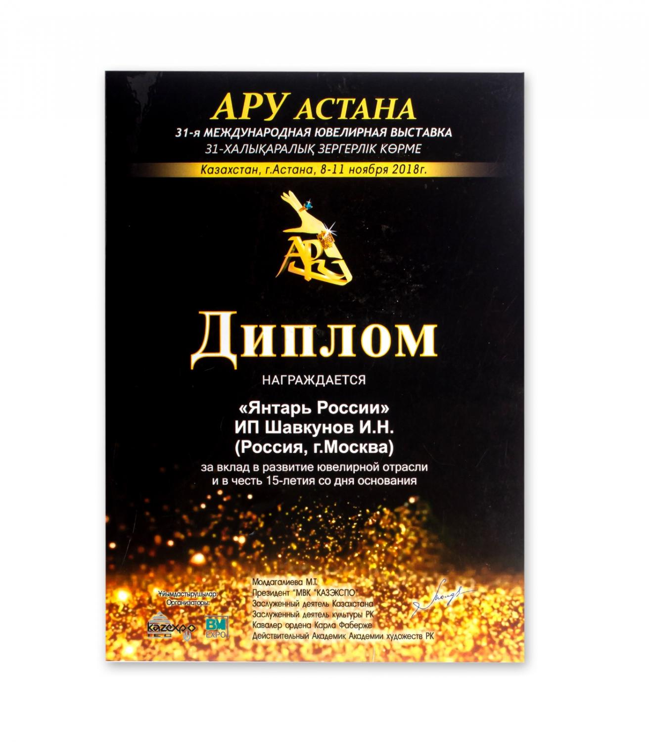 Диплом за вклад в развитие ювелирного бизнеса в Казахстане и в честь 25-ой юбилейной Международной выставки "Ару"